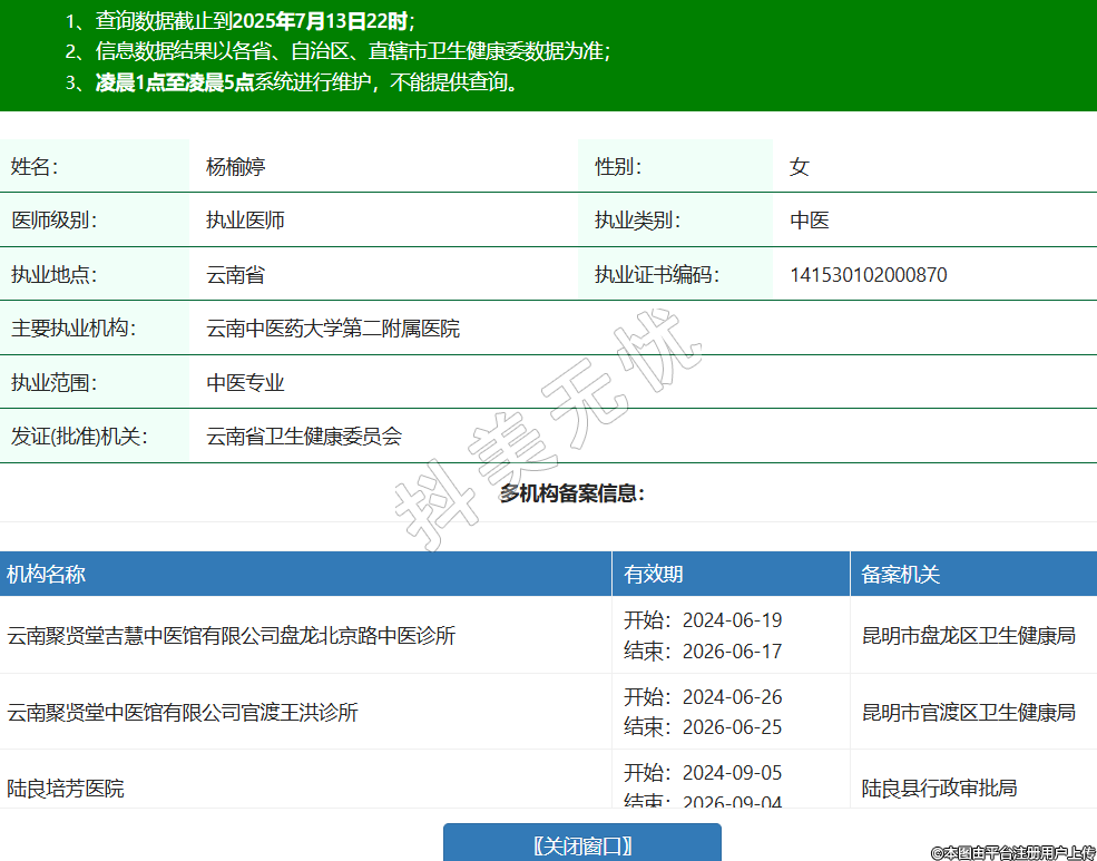 姓名:楊榆婷性別:女醫(yī)師級別:執(zhí)業(yè)醫(yī)師執(zhí)業(yè)類別:中醫(yī)執(zhí)業(yè)地點(diǎn):云南省執(zhí)業(yè)證書編碼:141530102000870主要執(zhí)業(yè)機(jī)構(gòu):云南中醫(yī)藥大學(xué)第二附屬醫(yī)院執(zhí)業(yè)范圍:中醫(yī)專業(yè)發(fā)證(批準(zhǔn))機(jī)關(guān):云南省衛(wèi)生健康委員會多機(jī)構(gòu)備案信息:機(jī)構(gòu)名稱 有效期 備案機(jī)關(guān) 云南聚賢堂吉慧中醫(yī)館有限公司盤龍北京路中醫(yī)診所 開始:2024-06-19結(jié)束:2026-06-17昆明市盤龍區(qū)衛(wèi)生健康局 云南聚賢堂中醫(yī)館有限公司官渡王洪診所 開始:2024-06-26結(jié)束:2026-06-25昆明市官渡區(qū)衛(wèi)生健康局 陸良培芳醫(yī)院 開始:2024-09-05結(jié)束:2026-09-04陸良縣行政審批局 -