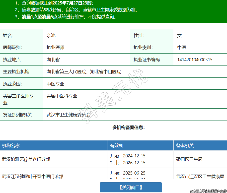 姓名:余池性別:女醫(yī)師級(jí)別:執(zhí)業(yè)醫(yī)師執(zhí)業(yè)類別:中醫(yī)執(zhí)業(yè)地點(diǎn):湖北省執(zhí)業(yè)證書(shū)編碼:141420104000315主要執(zhí)業(yè)機(jī)構(gòu):湖北省第三人民醫(yī)院、湖北省中山醫(yī)院執(zhí)業(yè)范圍:中醫(yī)專業(yè)美容主診醫(yī)師專業(yè):美容中醫(yī)科專業(yè)發(fā)證(批準(zhǔn))機(jī)關(guān):武漢市衛(wèi)生健康委員會(huì)多機(jī)構(gòu)備案信息:機(jī)構(gòu)名稱 有效期 備案機(jī)關(guān) 武漢泊雅醫(yī)療美容門診部 開(kāi)始:2024-12-15結(jié)束:2026-12-15硚口區(qū)衛(wèi)生局 武漢江漢健民葉開(kāi)泰中醫(yī)門診部 開(kāi)始:2025-06-25結(jié)束:2030-06-24武漢市江漢區(qū)衛(wèi)生健康局 -
