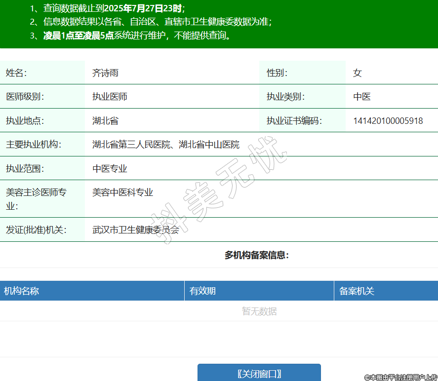 姓名:齊詩雨性別:女醫(yī)師級(jí)別:執(zhí)業(yè)醫(yī)師執(zhí)業(yè)類別:中醫(yī)執(zhí)業(yè)地點(diǎn):湖北省執(zhí)業(yè)證書編碼:141420100005918主要執(zhí)業(yè)機(jī)構(gòu):湖北省第三人民醫(yī)院、湖北省中山醫(yī)院執(zhí)業(yè)范圍:中醫(yī)專業(yè)美容主診醫(yī)師專業(yè):美容中醫(yī)科專業(yè)發(fā)證(批準(zhǔn))機(jī)關(guān):武漢市衛(wèi)生健康委員會(huì) -