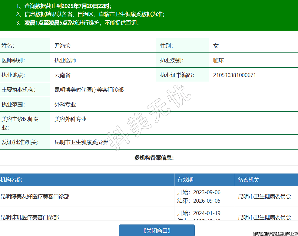 姓名:尹海榮性別:女醫(yī)師級(jí)別:執(zhí)業(yè)醫(yī)師執(zhí)業(yè)類別:臨床執(zhí)業(yè)地點(diǎn):云南省執(zhí)業(yè)證書(shū)編碼:210530381000671主要執(zhí)業(yè)機(jī)構(gòu):昆明博美時(shí)代醫(yī)療美容門診部執(zhí)業(yè)范圍:外科專業(yè)美容主診醫(yī)師專業(yè):美容外科專業(yè)發(fā)證(批準(zhǔn))機(jī)關(guān):昆明市衛(wèi)生健康委員會(huì)多機(jī)構(gòu)備案信息:機(jī)構(gòu)名稱 有效期 備案機(jī)關(guān) 昆明博美友好醫(yī)療美容門診部 開(kāi)始:2023-09-06結(jié)束:2026-09-05昆明市衛(wèi)生健康委員會(huì) 昆明珠璣醫(yī)療美容門診部 開(kāi)始:2024-01-19結(jié)束:2025-12-18昆明市衛(wèi)生健康委員會(huì) 云南比爾西希生物科技有限公司盤(pán)龍麗水雅苑醫(yī)療美容診所 開(kāi)始:2024-06-14結(jié)束:2027-06-14昆明市盤(pán)龍區(qū)衛(wèi)生健康局 紅河博美醫(yī)療美容門診部 開(kāi)始:2025-05-15結(jié)束:2026-05-14蒙自市衛(wèi)生健康局 -