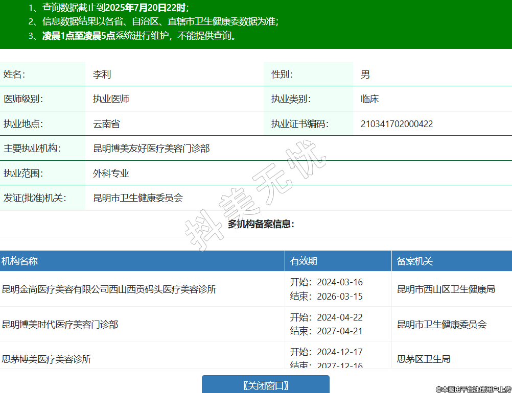 姓名:李利性別:男醫(yī)師級(jí)別:執(zhí)業(yè)醫(yī)師執(zhí)業(yè)類別:臨床執(zhí)業(yè)地點(diǎn):云南省執(zhí)業(yè)證書編碼:210341702000422主要執(zhí)業(yè)機(jī)構(gòu):昆明博美友好醫(yī)療美容門診部執(zhí)業(yè)范圍:外科專業(yè)發(fā)證(批準(zhǔn))機(jī)關(guān):昆明市衛(wèi)生健康委員會(huì)多機(jī)構(gòu)備案信息:機(jī)構(gòu)名稱 有效期 備案機(jī)關(guān) 昆明金尚醫(yī)療美容有限公司西山西貢碼頭醫(yī)療美容診所 開始:2024-03-16結(jié)束:2026-03-15昆明市西山區(qū)衛(wèi)生健康局 昆明博美時(shí)代醫(yī)療美容門診部 開始:2024-04-22結(jié)束:2027-04-21昆明市衛(wèi)生健康委員會(huì) 思茅博美醫(yī)療美容診所 開始:2024-12-17結(jié)束:2027-12-16思茅區(qū)衛(wèi)生局 -