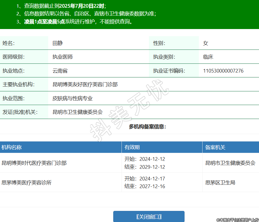姓名:田靜性別:女醫(yī)師級別:執(zhí)業(yè)醫(yī)師執(zhí)業(yè)類別:臨床執(zhí)業(yè)地點:云南省執(zhí)業(yè)證書編碼:110530000007276主要執(zhí)業(yè)機構(gòu):昆明博美友好醫(yī)療美容門診部執(zhí)業(yè)范圍:皮膚病與性病專業(yè)發(fā)證(批準(zhǔn))機關(guān):昆明市衛(wèi)生健康委員會多機構(gòu)備案信息:機構(gòu)名稱 有效期 備案機關(guān) 昆明博美時代醫(yī)療美容門診部 開始:2024-12-12結(jié)束:2029-12-12昆明市衛(wèi)生健康委員會 思茅博美醫(yī)療美容診所 開始:2024-12-17結(jié)束:2027-12-16思茅區(qū)衛(wèi)生局 -