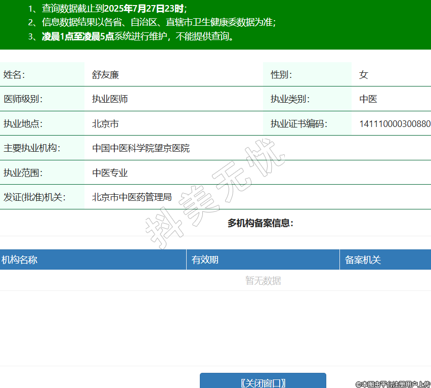 姓名:舒友廉性別:女醫(yī)師級(jí)別:執(zhí)業(yè)醫(yī)師執(zhí)業(yè)類別:中醫(yī)執(zhí)業(yè)地點(diǎn):北京市執(zhí)業(yè)證書編碼:141110000300880主要執(zhí)業(yè)機(jī)構(gòu):中國中醫(yī)科學(xué)院望京醫(yī)院執(zhí)業(yè)范圍:中醫(yī)專業(yè)發(fā)證(批準(zhǔn))機(jī)關(guān):北京市中醫(yī)藥管理局 -