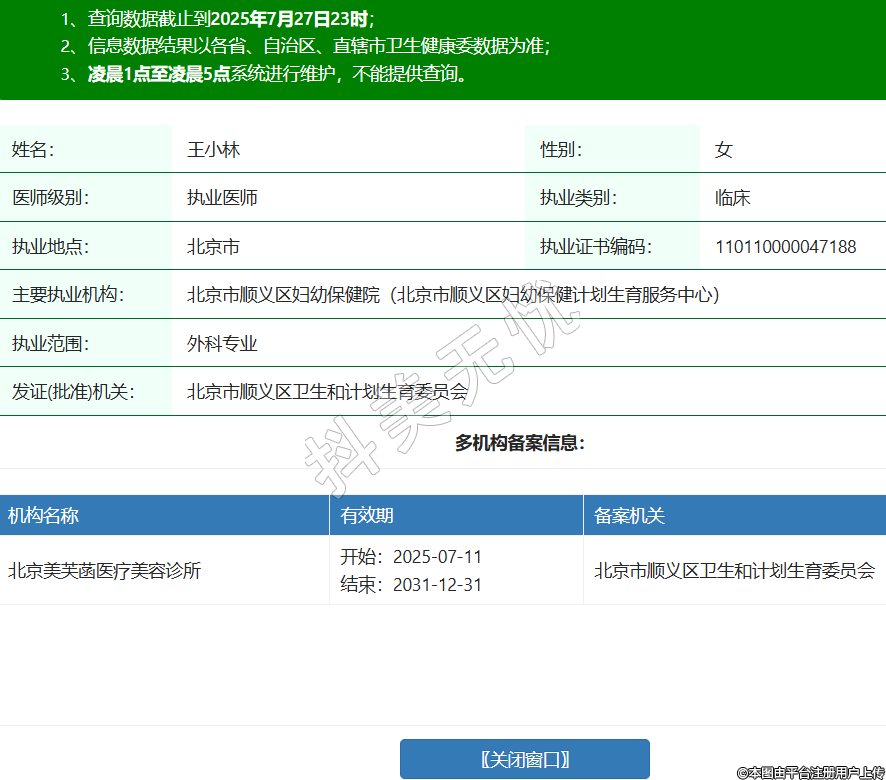 姓名:王小林性別:女醫(yī)師級別:執(zhí)業(yè)醫(yī)師執(zhí)業(yè)類別:臨床執(zhí)業(yè)地點:北京市執(zhí)業(yè)證書編碼:110110000047188主要執(zhí)業(yè)機構(gòu):北京市順義區(qū)婦幼保健院(北京市順義區(qū)婦幼保健計劃生育服務(wù)中心)執(zhí)業(yè)范圍:外科專業(yè)發(fā)證(批準)機關(guān):北京市順義區(qū)衛(wèi)生和計劃生育委員會多機構(gòu)備案信息:機構(gòu)名稱 有效期 備案機關(guān) 北京美芙菡醫(yī)療美容診所 開始:2025-07-11結(jié)束:2031-12-31北京市順義區(qū)衛(wèi)生和計劃生育委員會 -