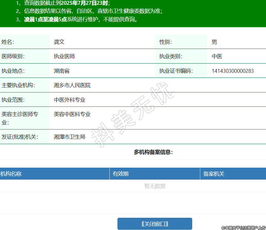 姓名:龔文性別:男醫(yī)師級別:執(zhí)業(yè)醫(yī)師執(zhí)業(yè)類別:中醫(yī)執(zhí)業(yè)地點:湖南省執(zhí)業(yè)證書編碼:141430300000283主要執(zhí)業(yè)機構(gòu):湘鄉(xiāng)市人民醫(yī)院執(zhí)業(yè)范圍:中醫(yī)外科專業(yè)美容主診醫(yī)師專業(yè):美容中醫(yī)科專業(yè)發(fā)證(批準)機關(guān):湘潭市衛(wèi)生局 -