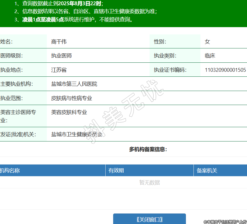 姓名:商干偉性別:女醫(yī)師級(jí)別:執(zhí)業(yè)醫(yī)師執(zhí)業(yè)類別:臨床執(zhí)業(yè)地點(diǎn):江蘇省執(zhí)業(yè)證書編碼:110320900001505主要執(zhí)業(yè)機(jī)構(gòu):鹽城市第三人民醫(yī)院執(zhí)業(yè)范圍:皮膚病與性病專業(yè)美容主診醫(yī)師專業(yè):美容皮膚科專業(yè)發(fā)證(批準(zhǔn))機(jī)關(guān):鹽城市衛(wèi)生健康委員會(huì) -