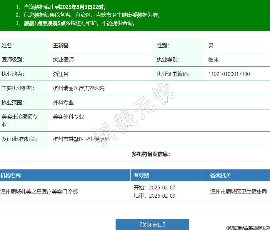 姓名:王新磊性別:男醫(yī)師級別:執(zhí)業(yè)醫(yī)師執(zhí)業(yè)類別:臨床執(zhí)業(yè)地點:浙江省執(zhí)業(yè)證書編碼:110210100017190主要執(zhí)業(yè)機構:杭州瑞麗醫(yī)療美容醫(yī)院執(zhí)業(yè)范圍:外科專業(yè)美容主診醫(yī)師專業(yè):美容外科專業(yè)發(fā)證(批準)機關:杭州市拱墅區(qū)衛(wèi)生健康局多機構備案信息:機構名稱 有效期 備案機關 溫州鹿城韓美之星醫(yī)療美容門診部 開始:2025-02-07結束:2026-02-09溫州市鹿城區(qū)衛(wèi)生健康局 -