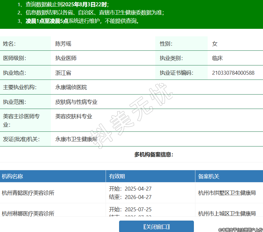 姓名:陳芳瑤性別:女醫(yī)師級(jí)別:執(zhí)業(yè)醫(yī)師執(zhí)業(yè)類別:臨床執(zhí)業(yè)地點(diǎn):浙江省執(zhí)業(yè)證書編碼:210330784000588主要執(zhí)業(yè)機(jī)構(gòu):永康瑞偵醫(yī)院執(zhí)業(yè)范圍:皮膚病與性病專業(yè)美容主診醫(yī)師專業(yè):美容皮膚科專業(yè)發(fā)證(批準(zhǔn))機(jī)關(guān):永康市衛(wèi)生健康局多機(jī)構(gòu)備案信息:機(jī)構(gòu)名稱 有效期 備案機(jī)關(guān) 杭州青懿醫(yī)療美容診所 開始:2025-04-27結(jié)束:2026-04-27杭州市拱墅區(qū)衛(wèi)生健康局 杭州琳娜醫(yī)療美容診所 開始:2025-07-25結(jié)束:2026-07-23杭州市上城區(qū)衛(wèi)生健康局 -