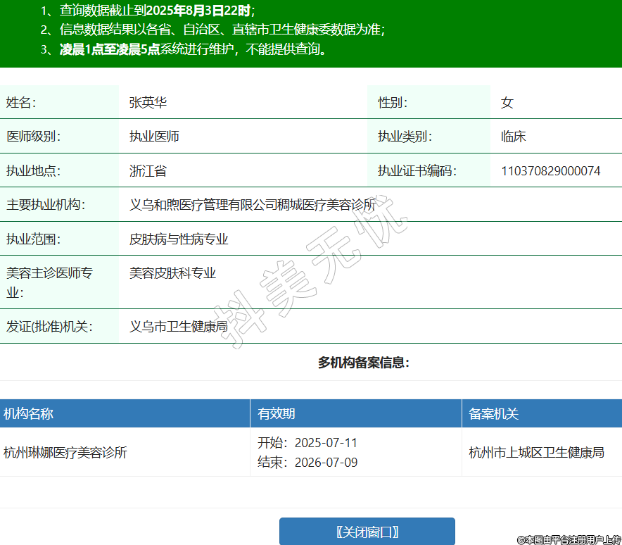 姓名:張英華性別:女醫(yī)師級(jí)別:執(zhí)業(yè)醫(yī)師執(zhí)業(yè)類(lèi)別:臨床執(zhí)業(yè)地點(diǎn):浙江省執(zhí)業(yè)證書(shū)編碼:110370829000074主要執(zhí)業(yè)機(jī)構(gòu):義烏和煦醫(yī)療管理有限公司稠城醫(yī)療美容診所執(zhí)業(yè)范圍:皮膚病與性病專業(yè)美容主診醫(yī)師專業(yè):美容皮膚科專業(yè)發(fā)證(批準(zhǔn))機(jī)關(guān):義烏市衛(wèi)生健康局多機(jī)構(gòu)備案信息:機(jī)構(gòu)名稱 有效期 備案機(jī)關(guān) 杭州琳娜醫(yī)療美容診所 開(kāi)始:2025-07-11結(jié)束:2026-07-09杭州市上城區(qū)衛(wèi)生健康局 -
