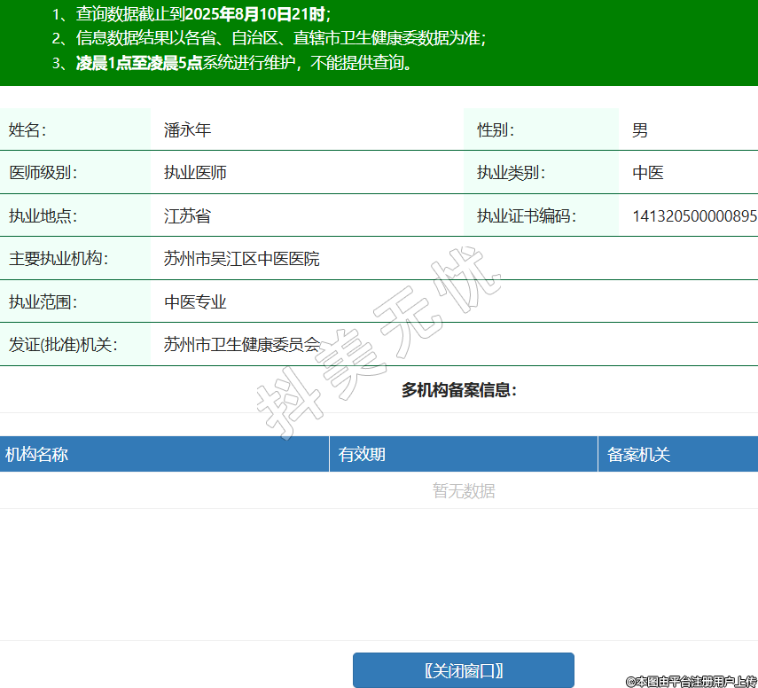 姓名:潘永年性別:男醫(yī)師級(jí)別:執(zhí)業(yè)醫(yī)師執(zhí)業(yè)類別:中醫(yī)執(zhí)業(yè)地點(diǎn):江蘇省執(zhí)業(yè)證書編碼:141320500000895主要執(zhí)業(yè)機(jī)構(gòu):蘇州市吳江區(qū)中醫(yī)醫(yī)院執(zhí)業(yè)范圍:中醫(yī)專業(yè)發(fā)證(批準(zhǔn))機(jī)關(guān):蘇州市衛(wèi)生健康委員會(huì) -