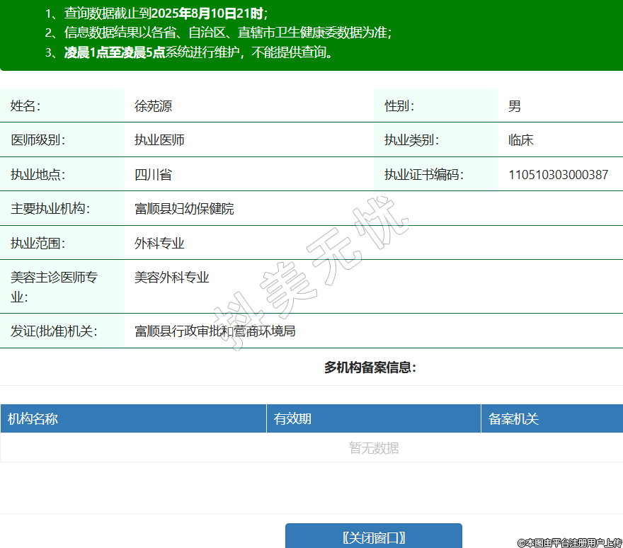 姓名:徐苑源性別:男醫(yī)師級別:執(zhí)業(yè)醫(yī)師執(zhí)業(yè)類別:臨床執(zhí)業(yè)地點:四川省執(zhí)業(yè)證書編碼:110510303000387主要執(zhí)業(yè)機構(gòu):富順縣婦幼保健院執(zhí)業(yè)范圍:外科專業(yè)美容主診醫(yī)師專業(yè):美容外科專業(yè)發(fā)證(批準)機關(guān):富順縣行政審批和營商環(huán)境局 -