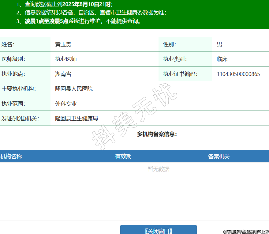 姓名:黃玉貴性別:男醫(yī)師級(jí)別:執(zhí)業(yè)醫(yī)師執(zhí)業(yè)類別:臨床執(zhí)業(yè)地點(diǎn):湖南省執(zhí)業(yè)證書(shū)編碼:110430500000865主要執(zhí)業(yè)機(jī)構(gòu):隆回縣人民醫(yī)院執(zhí)業(yè)范圍:外科專業(yè)發(fā)證(批準(zhǔn))機(jī)關(guān):隆回縣衛(wèi)生健康局 -