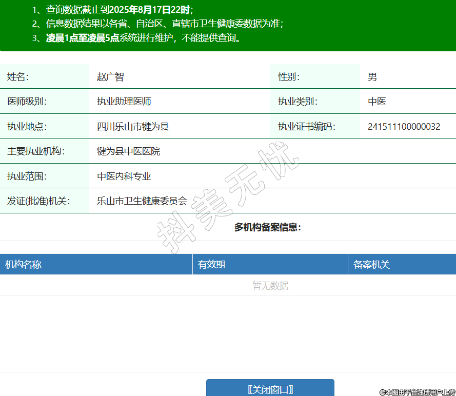 姓名:趙廣智性別:男醫(yī)師級(jí)別:執(zhí)業(yè)助理醫(yī)師執(zhí)業(yè)類別:中醫(yī)執(zhí)業(yè)地點(diǎn):四川樂(lè)山市犍為縣執(zhí)業(yè)證書編碼:241511100000032主要執(zhí)業(yè)機(jī)構(gòu):犍為縣中醫(yī)醫(yī)院執(zhí)業(yè)范圍:中醫(yī)內(nèi)科專業(yè)發(fā)證(批準(zhǔn))機(jī)關(guān):樂(lè)山市衛(wèi)生健康委員會(huì) -