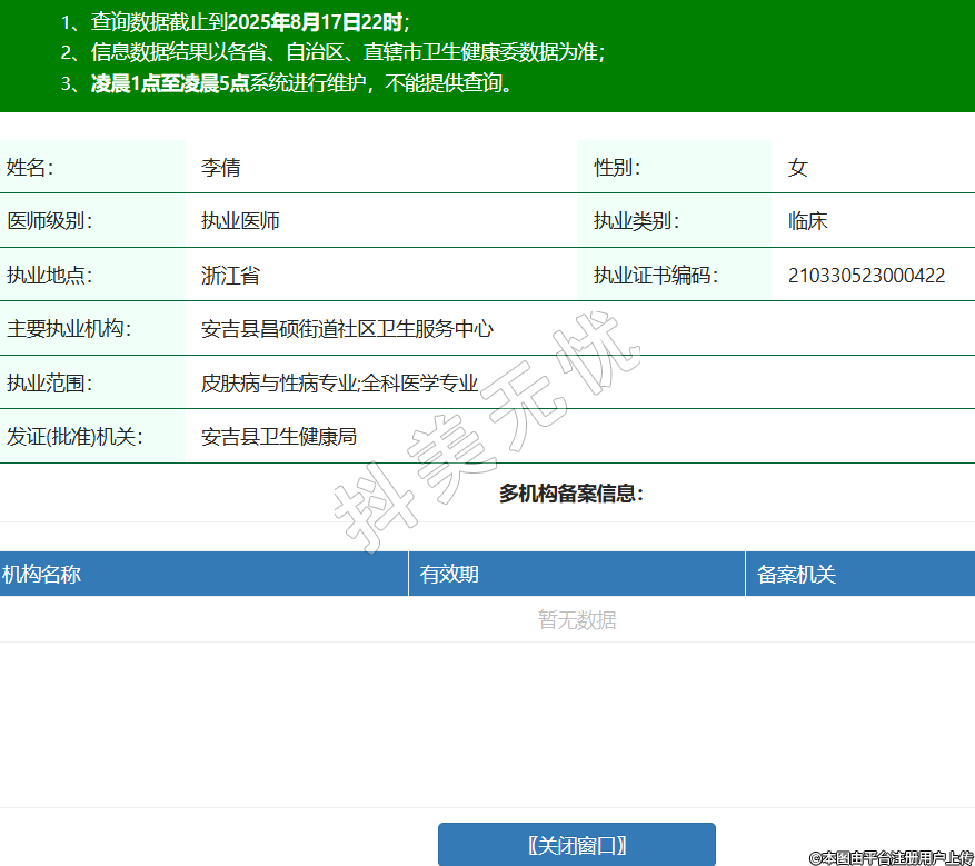 姓名:李倩性別:女醫(yī)師級別:執(zhí)業(yè)醫(yī)師執(zhí)業(yè)類別:臨床執(zhí)業(yè)地點:浙江省執(zhí)業(yè)證書編碼:210330523000422主要執(zhí)業(yè)機(jī)構(gòu):安吉縣昌碩街道社區(qū)衛(wèi)生服務(wù)中心執(zhí)業(yè)范圍:皮膚病與性病專業(yè);全科醫(yī)學(xué)專業(yè)發(fā)證(批準(zhǔn))機(jī)關(guān):安吉縣衛(wèi)生健康局 -