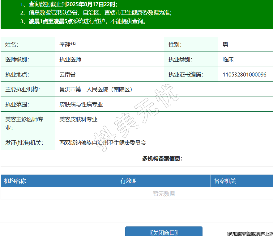 姓名:李靜華性別:男醫(yī)師級別:執(zhí)業(yè)醫(yī)師執(zhí)業(yè)類別:臨床執(zhí)業(yè)地點(diǎn):云南省執(zhí)業(yè)證書編碼:110532801000096主要執(zhí)業(yè)機(jī)構(gòu):景洪市第一人民醫(yī)院(南院區(qū))執(zhí)業(yè)范圍:皮膚病與性病專業(yè)美容主診醫(yī)師專業(yè):美容皮膚科專業(yè)發(fā)證(批準(zhǔn))機(jī)關(guān):西雙版納傣族自治州衛(wèi)生健康委員會 -