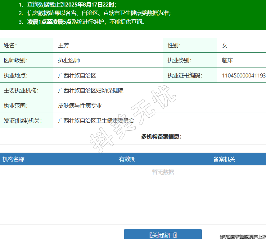 姓名:王芳性別:女醫(yī)師級(jí)別:執(zhí)業(yè)醫(yī)師執(zhí)業(yè)類別:臨床執(zhí)業(yè)地點(diǎn):廣西壯族自治區(qū)執(zhí)業(yè)證書(shū)編碼:110450000041193主要執(zhí)業(yè)機(jī)構(gòu):廣西壯族自治區(qū)婦幼保健院執(zhí)業(yè)范圍:皮膚病與性病專業(yè)發(fā)證(批準(zhǔn))機(jī)關(guān):廣西壯族自治區(qū)衛(wèi)生健康委員會(huì) -