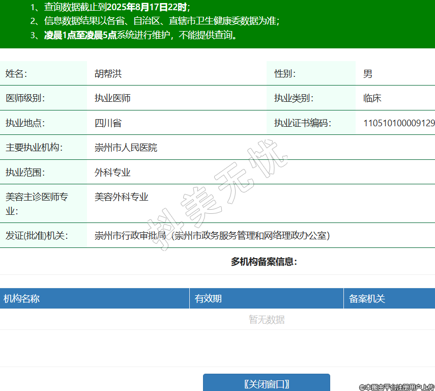 姓名:胡幫洪性別:男醫(yī)師級別:執(zhí)業(yè)醫(yī)師執(zhí)業(yè)類別:臨床執(zhí)業(yè)地點(diǎn):四川省執(zhí)業(yè)證書編碼:110510100009129主要執(zhí)業(yè)機(jī)構(gòu):崇州市人民醫(yī)院執(zhí)業(yè)范圍:外科專業(yè)美容主診醫(yī)師專業(yè):美容外科專業(yè)發(fā)證(批準(zhǔn))機(jī)關(guān):崇州市行政審批局(崇州市政務(wù)服務(wù)管理和網(wǎng)絡(luò)理政辦公室) -