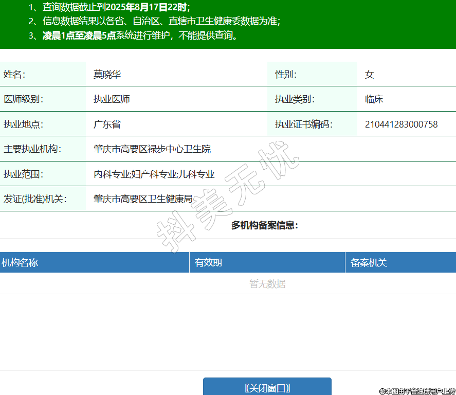 姓名:莫曉華性別:女醫(yī)師級別:執(zhí)業(yè)醫(yī)師執(zhí)業(yè)類別:臨床執(zhí)業(yè)地點:廣東省執(zhí)業(yè)證書編碼:210441283000758主要執(zhí)業(yè)機(jī)構(gòu):肇慶市高要區(qū)祿步中心衛(wèi)生院執(zhí)業(yè)范圍:內(nèi)科專業(yè);婦產(chǎn)科專業(yè);兒科專業(yè)發(fā)證(批準(zhǔn))機(jī)關(guān):肇慶市高要區(qū)衛(wèi)生健康局 -