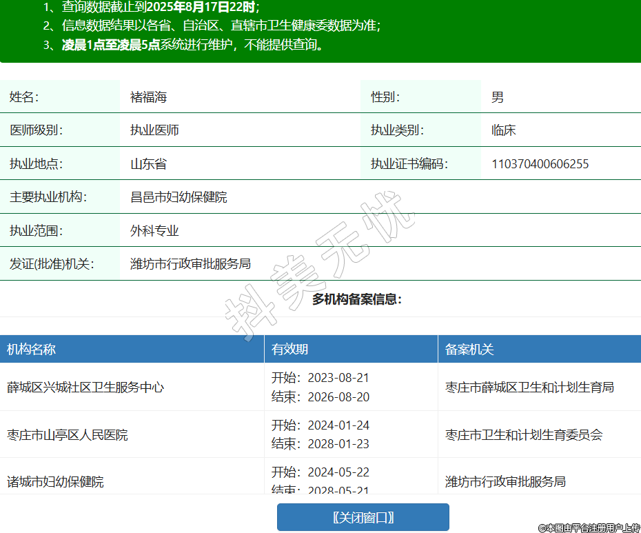 姓名:褚福海性別:男醫(yī)師級別:執(zhí)業(yè)醫(yī)師執(zhí)業(yè)類別:臨床執(zhí)業(yè)地點:山東省執(zhí)業(yè)證書編碼:110370400606255主要執(zhí)業(yè)機構(gòu):昌邑市婦幼保健院執(zhí)業(yè)范圍:外科專業(yè)發(fā)證(批準)機關(guān):濰坊市行政審批服務局多機構(gòu)備案信息:機構(gòu)名稱 有效期 備案機關(guān) 薛城區(qū)興城社區(qū)衛(wèi)生服務中心 開始:2023-08-21結(jié)束:2026-08-20棗莊市薛城區(qū)衛(wèi)生和計劃生育局 棗莊市山亭區(qū)人民醫(yī)院 開始:2024-01-24結(jié)束:2028-01-23棗莊市衛(wèi)生和計劃生育委員會 諸城市婦幼保健院 開始:2024-05-22結(jié)束:2028-05-21濰坊市行政審批服務局 -