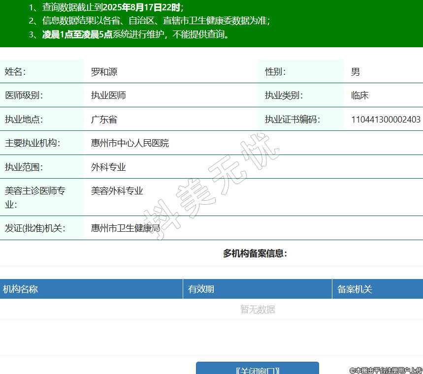 姓名:羅和源性別:男醫(yī)師級別:執(zhí)業(yè)醫(yī)師執(zhí)業(yè)類別:臨床執(zhí)業(yè)地點(diǎn):廣東省執(zhí)業(yè)證書編碼:110441300002403主要執(zhí)業(yè)機(jī)構(gòu):惠州市中心人民醫(yī)院執(zhí)業(yè)范圍:外科專業(yè)美容主診醫(yī)師專業(yè):美容外科專業(yè)發(fā)證(批準(zhǔn))機(jī)關(guān):惠州市衛(wèi)生健康局 -