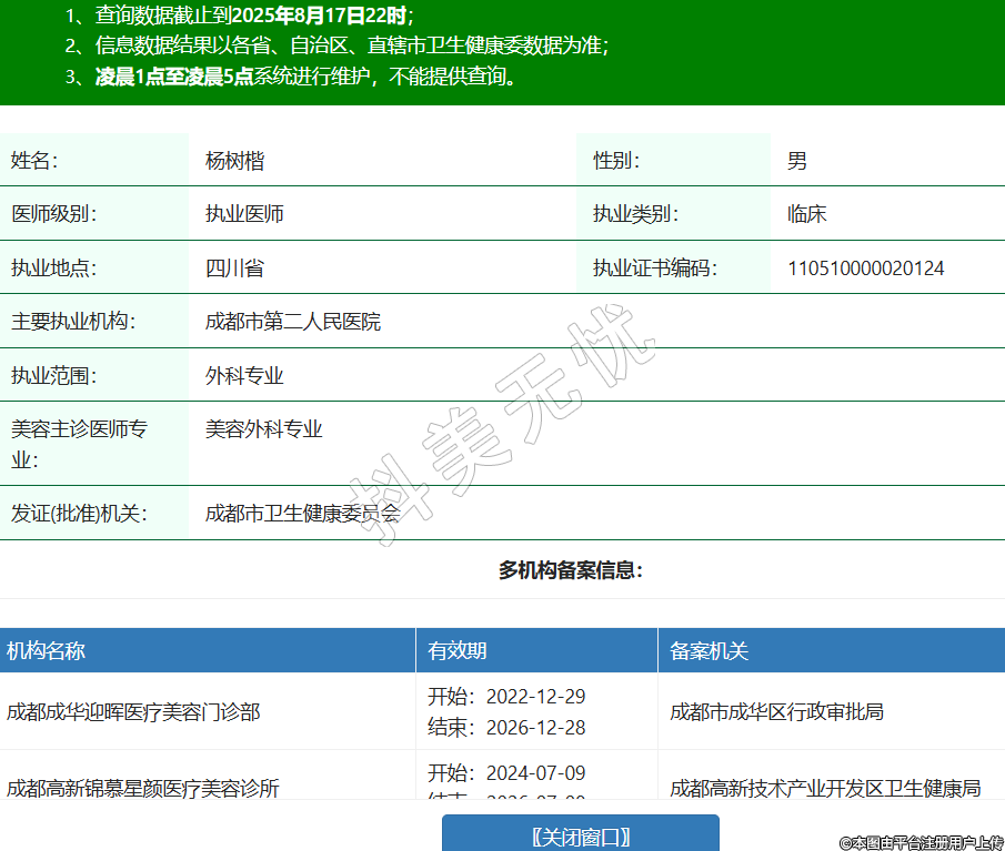 姓名:楊樹楷性別:男醫(yī)師級別:執(zhí)業(yè)醫(yī)師執(zhí)業(yè)類別:臨床執(zhí)業(yè)地點(diǎn):四川省執(zhí)業(yè)證書編碼:110510000020124主要執(zhí)業(yè)機(jī)構(gòu):成都市第二人民醫(yī)院執(zhí)業(yè)范圍:外科專業(yè)美容主診醫(yī)師專業(yè):美容外科專業(yè)發(fā)證(批準(zhǔn))機(jī)關(guān):成都市衛(wèi)生健康委員會多機(jī)構(gòu)備案信息:機(jī)構(gòu)名稱 有效期 備案機(jī)關(guān) 成都成華迎暉醫(yī)療美容門診部 開始:2022-12-29結(jié)束:2026-12-28成都市成華區(qū)行政審批局 成都高新錦慕星顏醫(yī)療美容診所 開始:2024-07-09結(jié)束:2026-07-08成都高新技術(shù)產(chǎn)業(yè)開發(fā)區(qū)衛(wèi)生健康局 成都金牛蕊森醫(yī)療美容門診部 開始:2024-10-21結(jié)束:2025-10-22成都市金牛區(qū)政務(wù)服務(wù)管理和行政審批局 安岳縣婦幼保健計劃生育服務(wù)中心 開始:2024-12-14結(jié)束:2025-12-20資陽市衛(wèi)生健康委員會 成都武侯菁致達(dá)醫(yī)療美容門診部 開始:2025-03-06結(jié)束:2026-03-05成都市武侯區(qū)行政審批局 成都錦江微美悅己醫(yī)療美容門診部 開始:2025-05-24結(jié)束:2026-05-24成都市錦江區(qū)行政審批局 -