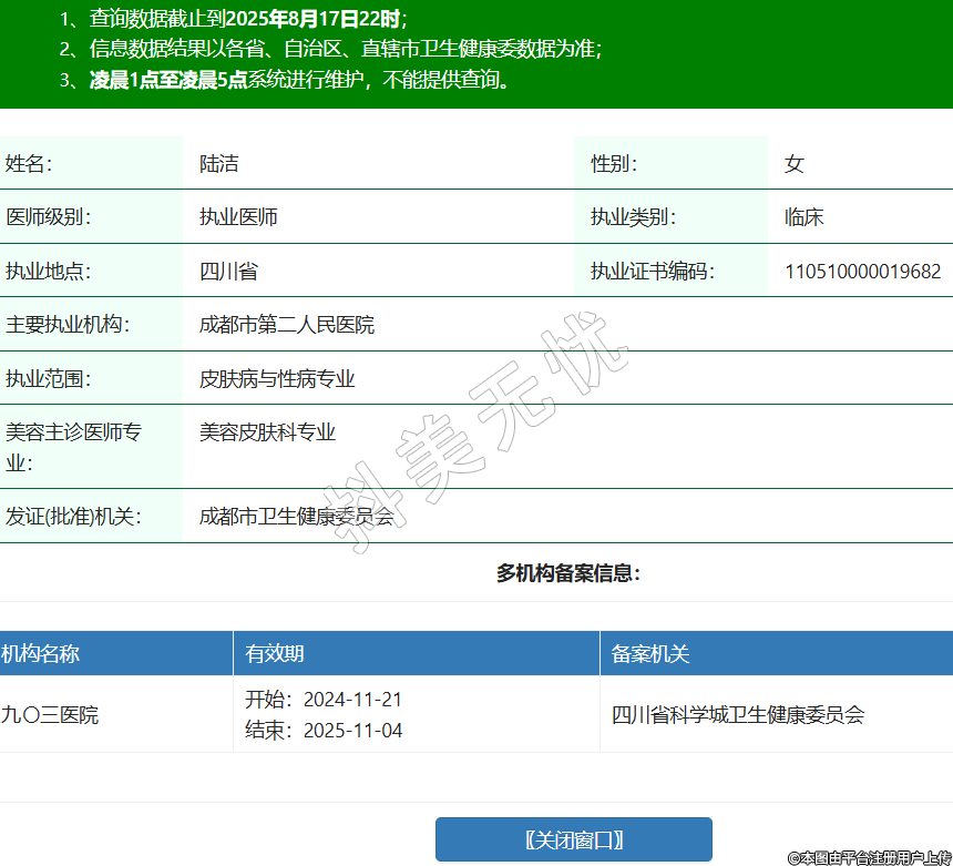姓名:陸潔性別:女醫(yī)師級別:執(zhí)業(yè)醫(yī)師執(zhí)業(yè)類別:臨床執(zhí)業(yè)地點(diǎn):四川省執(zhí)業(yè)證書編碼:110510000019682主要執(zhí)業(yè)機(jī)構(gòu):成都市第二人民醫(yī)院執(zhí)業(yè)范圍:皮膚病與性病專業(yè)美容主診醫(yī)師專業(yè):美容皮膚科專業(yè)發(fā)證(批準(zhǔn))機(jī)關(guān):成都市衛(wèi)生健康委員會多機(jī)構(gòu)備案信息:機(jī)構(gòu)名稱 有效期 備案機(jī)關(guān) 九〇三醫(yī)院 開始:2024-11-21結(jié)束:2025-11-04四川省科學(xué)城衛(wèi)生健康委員會 -
