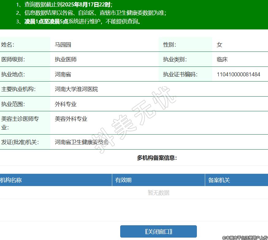 姓名:馬園園性別:女醫(yī)師級別:執(zhí)業(yè)醫(yī)師執(zhí)業(yè)類別:臨床執(zhí)業(yè)地點:河南省執(zhí)業(yè)證書編碼:110410000081484主要執(zhí)業(yè)機構(gòu):河南大學(xué)淮河醫(yī)院執(zhí)業(yè)范圍:外科專業(yè)美容主診醫(yī)師專業(yè):美容外科專業(yè)發(fā)證(批準)機關(guān):河南省衛(wèi)生健康委員會 -