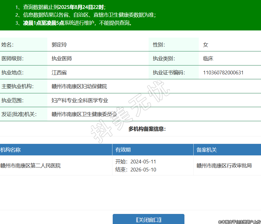 姓名:郭定玲性別:女醫(yī)師級(jí)別:執(zhí)業(yè)醫(yī)師執(zhí)業(yè)類別:臨床執(zhí)業(yè)地點(diǎn):江西省執(zhí)業(yè)證書編碼:110360782000631主要執(zhí)業(yè)機(jī)構(gòu):贛州市南康區(qū)婦幼保健院執(zhí)業(yè)范圍:婦產(chǎn)科專業(yè);全科醫(yī)學(xué)專業(yè)發(fā)證(批準(zhǔn))機(jī)關(guān):贛州市南康區(qū)衛(wèi)生健康委員會(huì)多機(jī)構(gòu)備案信息:機(jī)構(gòu)名稱 有效期 備案機(jī)關(guān) 贛州市南康區(qū)第二人民醫(yī)院 開(kāi)始:2024-05-11結(jié)束:2026-05-10贛州市南康區(qū)行政審批局 -