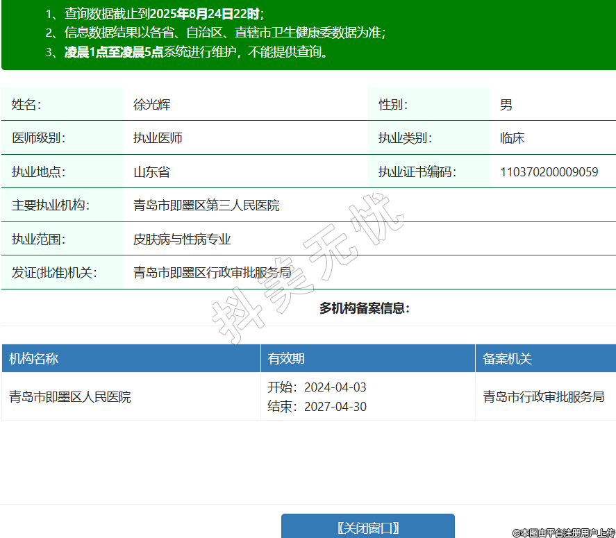 姓名:徐光輝性別:男醫(yī)師級別:執(zhí)業(yè)醫(yī)師執(zhí)業(yè)類別:臨床執(zhí)業(yè)地點:山東省執(zhí)業(yè)證書編碼:110370200009059主要執(zhí)業(yè)機構:青島市即墨區(qū)第三人民醫(yī)院執(zhí)業(yè)范圍:皮膚病與性病專業(yè)發(fā)證(批準)機關:青島市即墨區(qū)行政審批服務局多機構備案信息:機構名稱 有效期 備案機關 青島市即墨區(qū)人民醫(yī)院 開始:2024-04-03結束:2027-04-30青島市行政審批服務局 -
