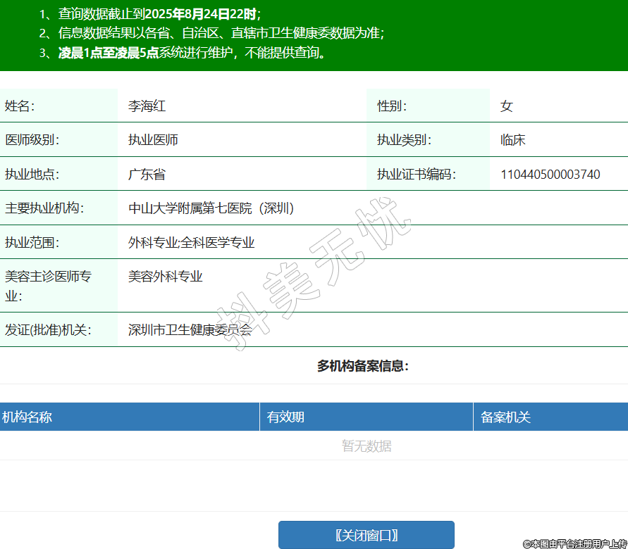 姓名:李海紅性別:女醫(yī)師級(jí)別:執(zhí)業(yè)醫(yī)師執(zhí)業(yè)類別:臨床執(zhí)業(yè)地點(diǎn):廣東省執(zhí)業(yè)證書編碼:110440500003740主要執(zhí)業(yè)機(jī)構(gòu):中山大學(xué)附屬第七醫(yī)院(深圳)執(zhí)業(yè)范圍:外科專業(yè);全科醫(yī)學(xué)專業(yè)美容主診醫(yī)師專業(yè):美容外科專業(yè)發(fā)證(批準(zhǔn))機(jī)關(guān):深圳市衛(wèi)生健康委員會(huì) -