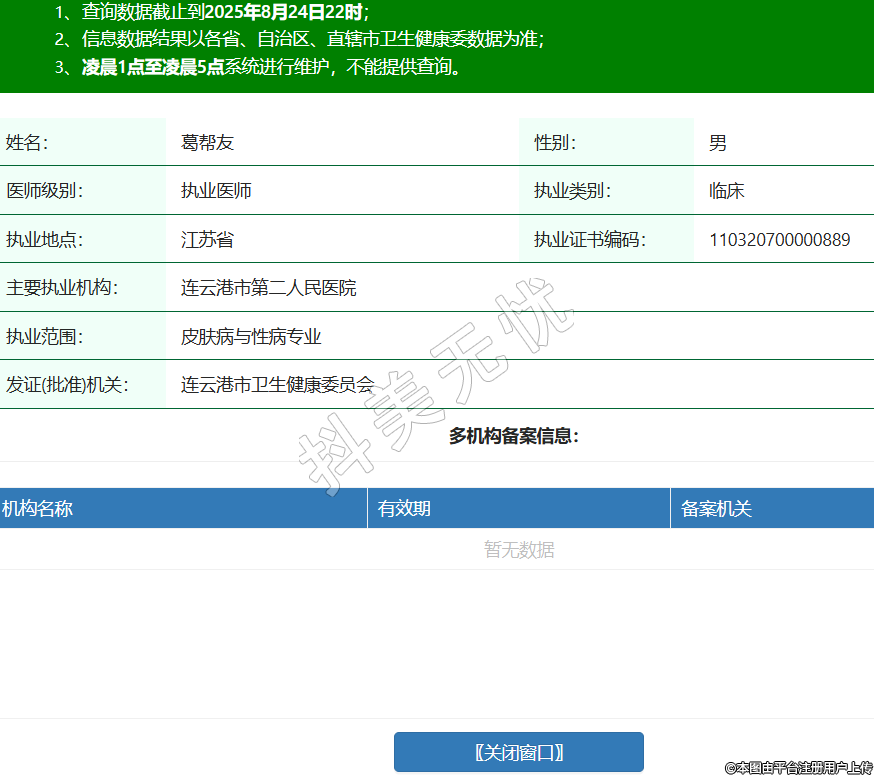 姓名:葛幫友性別:男醫(yī)師級(jí)別:執(zhí)業(yè)醫(yī)師執(zhí)業(yè)類(lèi)別:臨床執(zhí)業(yè)地點(diǎn):江蘇省執(zhí)業(yè)證書(shū)編碼:110320700000889主要執(zhí)業(yè)機(jī)構(gòu):連云港市第二人民醫(yī)院執(zhí)業(yè)范圍:皮膚病與性病專(zhuān)業(yè)發(fā)證(批準(zhǔn))機(jī)關(guān):連云港市衛(wèi)生健康委員會(huì) -