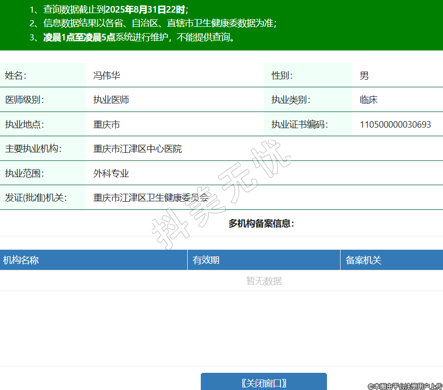 姓名:馮偉華性別:男醫(yī)師級(jí)別:執(zhí)業(yè)醫(yī)師執(zhí)業(yè)類(lèi)別:臨床執(zhí)業(yè)地點(diǎn):重慶市執(zhí)業(yè)證書(shū)編碼:110500000030693主要執(zhí)業(yè)機(jī)構(gòu):重慶市江津區(qū)中心醫(yī)院執(zhí)業(yè)范圍:外科專(zhuān)業(yè)發(fā)證(批準(zhǔn))機(jī)關(guān):重慶市江津區(qū)衛(wèi)生健康委員會(huì) -