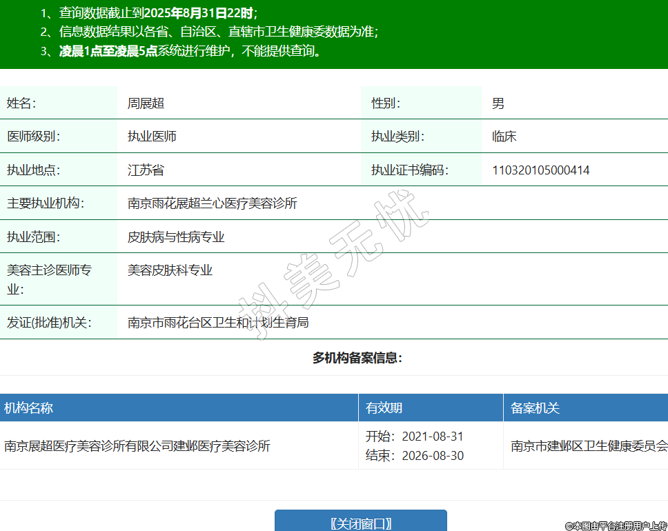 姓名:周展超性別:男醫(yī)師級別:執(zhí)業(yè)醫(yī)師執(zhí)業(yè)類別:臨床執(zhí)業(yè)地點(diǎn):江蘇省執(zhí)業(yè)證書編碼:110320105000414主要執(zhí)業(yè)機(jī)構(gòu):南京雨花展超蘭心醫(yī)療美容診所執(zhí)業(yè)范圍:皮膚病與性病專業(yè)美容主診醫(yī)師專業(yè):美容皮膚科專業(yè)發(fā)證(批準(zhǔn))機(jī)關(guān):南京市雨花臺區(qū)衛(wèi)生和計(jì)劃生育局多機(jī)構(gòu)備案信息:機(jī)構(gòu)名稱 有效期 備案機(jī)關(guān) 南京展超醫(yī)療美容診所有限公司建鄴醫(yī)療美容診所 開始:2021-08-31結(jié)束:2026-08-30南京市建鄴區(qū)衛(wèi)生健康委員會 -