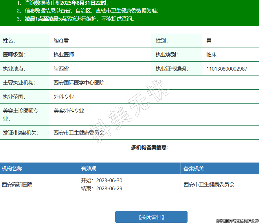 姓名:陶彥君性別:男醫(yī)師級別:執(zhí)業(yè)醫(yī)師執(zhí)業(yè)類別:臨床執(zhí)業(yè)地點(diǎn):陜西省執(zhí)業(yè)證書編碼:110130800002987主要執(zhí)業(yè)機(jī)構(gòu):西安國際醫(yī)學(xué)中心醫(yī)院執(zhí)業(yè)范圍:外科專業(yè)美容主診醫(yī)師專業(yè):美容外科專業(yè)發(fā)證(批準(zhǔn))機(jī)關(guān):西安市衛(wèi)生健康委員會多機(jī)構(gòu)備案信息:機(jī)構(gòu)名稱 有效期 備案機(jī)關(guān) 西安高新醫(yī)院 開始:2023-06-30結(jié)束:2028-06-29西安市衛(wèi)生健康委員會 -