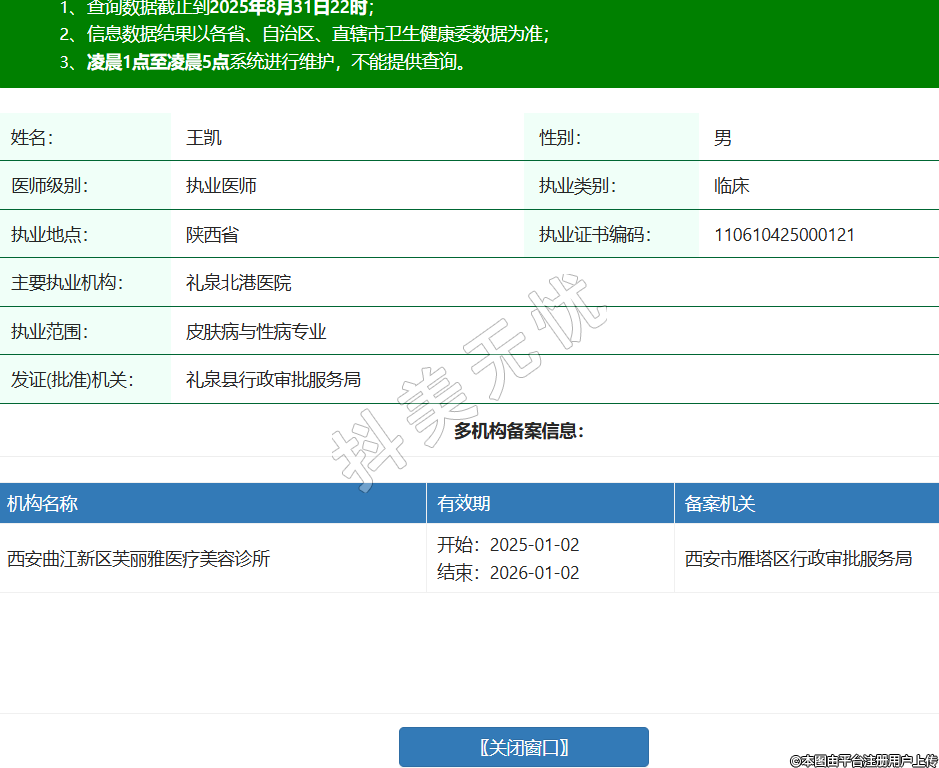 姓名:王凱性別:男醫(yī)師級別:執(zhí)業(yè)醫(yī)師執(zhí)業(yè)類別:臨床執(zhí)業(yè)地點:陜西省執(zhí)業(yè)證書編碼:110610425000121主要執(zhí)業(yè)機構(gòu):禮泉北港醫(yī)院執(zhí)業(yè)范圍:皮膚病與性病專業(yè)發(fā)證(批準)機關(guān):禮泉縣行政審批服務局多機構(gòu)備案信息:機構(gòu)名稱 有效期 備案機關(guān) 西安曲江新區(qū)芙麗雅醫(yī)療美容診所 開始:2025-01-02結(jié)束:2026-01-02西安市雁塔區(qū)行政審批服務局 -