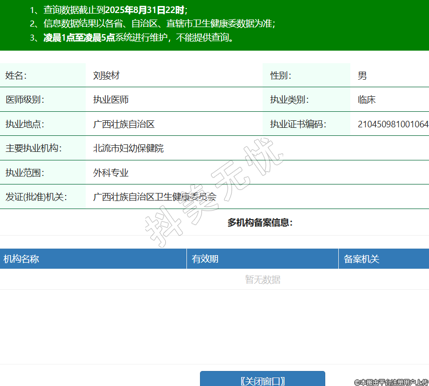 姓名:劉駿材性別:男醫(yī)師級別:執(zhí)業(yè)醫(yī)師執(zhí)業(yè)類別:臨床執(zhí)業(yè)地點:廣西壯族自治區(qū)執(zhí)業(yè)證書編碼:210450981001064主要執(zhí)業(yè)機構(gòu):北流市婦幼保健院執(zhí)業(yè)范圍:外科專業(yè)發(fā)證(批準(zhǔn))機關(guān):廣西壯族自治區(qū)衛(wèi)生健康委員會 -