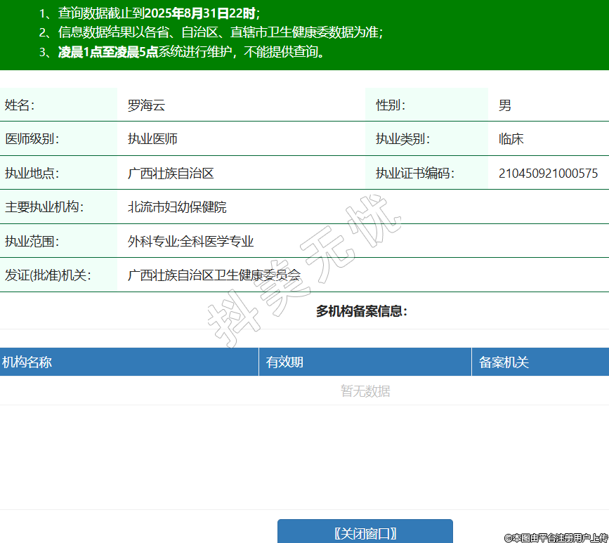姓名:羅海云性別:男醫(yī)師級(jí)別:執(zhí)業(yè)醫(yī)師執(zhí)業(yè)類(lèi)別:臨床執(zhí)業(yè)地點(diǎn):廣西壯族自治區(qū)執(zhí)業(yè)證書(shū)編碼:210450921000575主要執(zhí)業(yè)機(jī)構(gòu):北流市婦幼保健院執(zhí)業(yè)范圍:外科專(zhuān)業(yè);全科醫(yī)學(xué)專(zhuān)業(yè)發(fā)證(批準(zhǔn))機(jī)關(guān):廣西壯族自治區(qū)衛(wèi)生健康委員會(huì) -