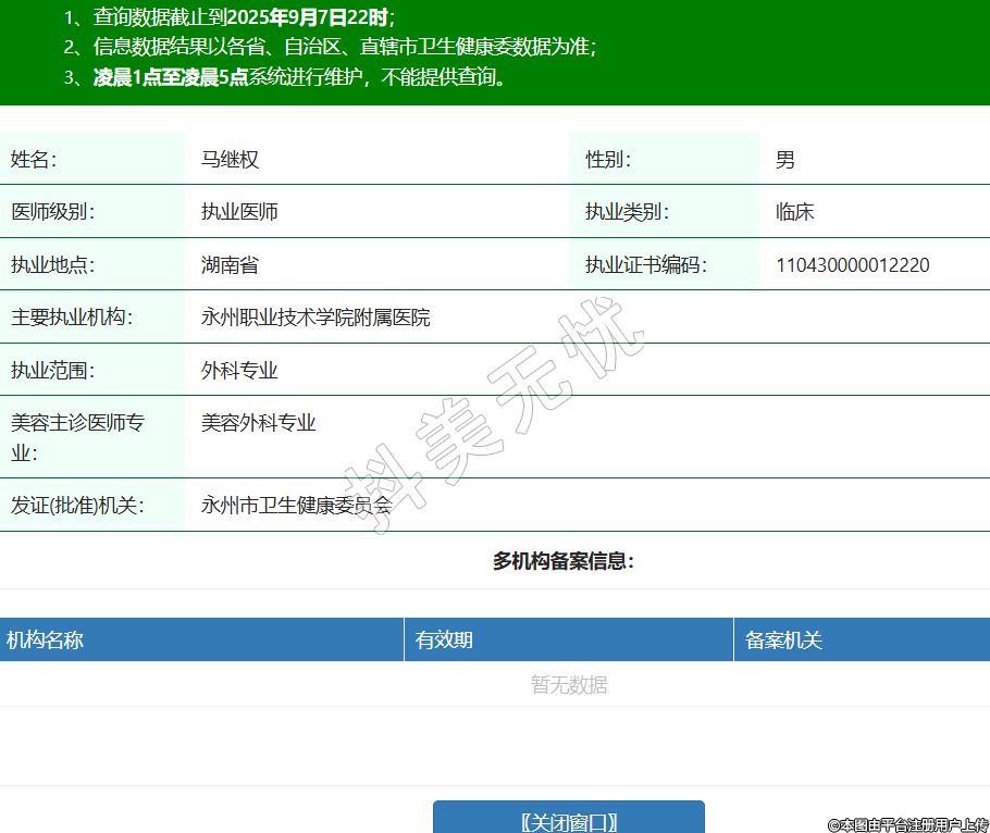 姓名:馬繼權(quán)性別:男醫(yī)師級別:執(zhí)業(yè)醫(yī)師執(zhí)業(yè)類別:臨床執(zhí)業(yè)地點(diǎn):湖南省執(zhí)業(yè)證書編碼:110430000012220主要執(zhí)業(yè)機(jī)構(gòu):永州職業(yè)技術(shù)學(xué)院附屬醫(yī)院執(zhí)業(yè)范圍:外科專業(yè)美容主診醫(yī)師專業(yè):美容外科專業(yè)發(fā)證(批準(zhǔn))機(jī)關(guān):永州市衛(wèi)生健康委員會 -