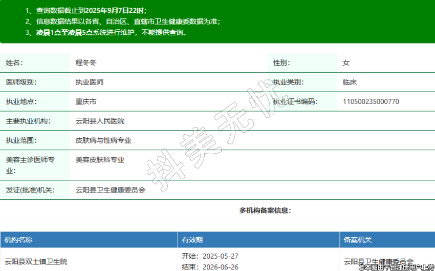姓名:程冬冬性別:女醫(yī)師級(jí)別:執(zhí)業(yè)醫(yī)師執(zhí)業(yè)類別:臨床執(zhí)業(yè)地點(diǎn):重慶市執(zhí)業(yè)證書(shū)編碼:110500235000770主要執(zhí)業(yè)機(jī)構(gòu):云陽(yáng)縣人民醫(yī)院執(zhí)業(yè)范圍:皮膚病與性病專業(yè)美容主診醫(yī)師專業(yè):美容皮膚科專業(yè)發(fā)證(批準(zhǔn))機(jī)關(guān):云陽(yáng)縣衛(wèi)生健康委員會(huì) -