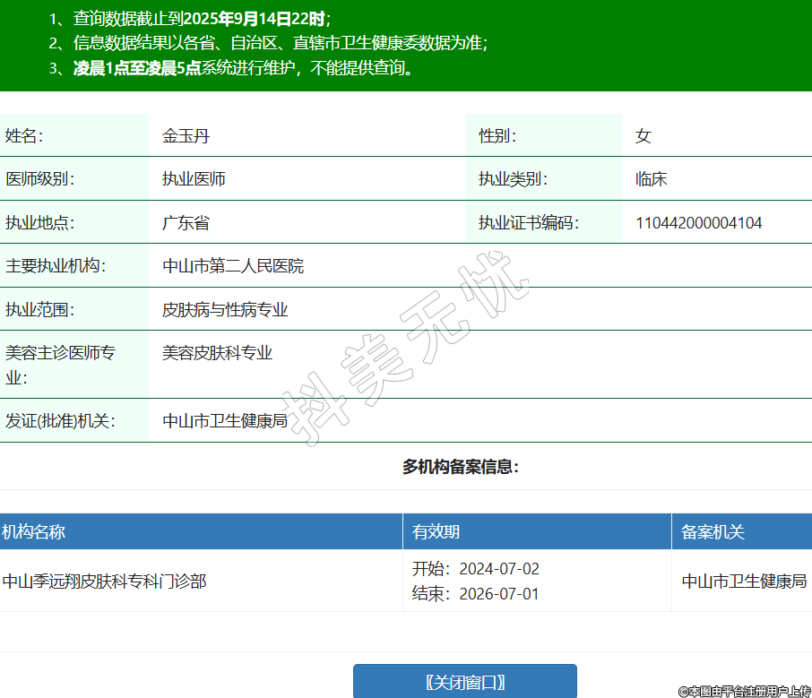 姓名:金玉丹性別:女醫(yī)師級(jí)別:執(zhí)業(yè)醫(yī)師執(zhí)業(yè)類別:臨床執(zhí)業(yè)地點(diǎn):廣東省執(zhí)業(yè)證書編碼:110442000004104主要執(zhí)業(yè)機(jī)構(gòu):中山市第二人民醫(yī)院執(zhí)業(yè)范圍:皮膚病與性病專業(yè)美容主診醫(yī)師專業(yè):美容皮膚科專業(yè)發(fā)證(批準(zhǔn))機(jī)關(guān):中山市衛(wèi)生健康局多機(jī)構(gòu)備案信息:機(jī)構(gòu)名稱 有效期 備案機(jī)關(guān) 中山季遠(yuǎn)翔皮膚科專科門診部 開始:2024-07-02結(jié)束:2026-07-01中山市衛(wèi)生健康局 -