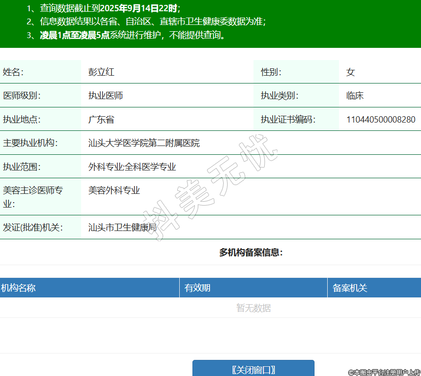 姓名:彭立紅性別:女醫(yī)師級別:執(zhí)業(yè)醫(yī)師執(zhí)業(yè)類別:臨床執(zhí)業(yè)地點:廣東省執(zhí)業(yè)證書編碼:110440500008280主要執(zhí)業(yè)機構(gòu):汕頭大學(xué)醫(yī)學(xué)院第二附屬醫(yī)院執(zhí)業(yè)范圍:外科專業(yè);全科醫(yī)學(xué)專業(yè)美容主診醫(yī)師專業(yè):美容外科專業(yè)發(fā)證(批準(zhǔn))機關(guān):汕頭市衛(wèi)生健康局 -