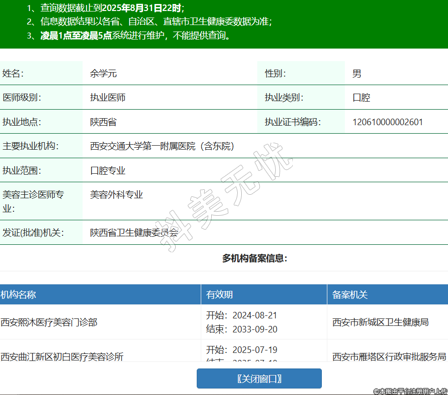 姓名:余學(xué)元性別:男醫(yī)師級(jí)別:執(zhí)業(yè)醫(yī)師執(zhí)業(yè)類別:口腔執(zhí)業(yè)地點(diǎn):陜西省執(zhí)業(yè)證書(shū)編碼:120610000002601主要執(zhí)業(yè)機(jī)構(gòu):西安交通大學(xué)第一附屬醫(yī)院(含東院)執(zhí)業(yè)范圍:口腔專業(yè)美容主診醫(yī)師專業(yè):美容外科專業(yè)發(fā)證(批準(zhǔn))機(jī)關(guān):陜西省衛(wèi)生健康委員會(huì)多機(jī)構(gòu)備案信息:機(jī)構(gòu)名稱 有效期 備案機(jī)關(guān) 西安熙沐醫(yī)療美容門(mén)診部 開(kāi)始:2024-08-21結(jié)束:2033-09-20西安市新城區(qū)衛(wèi)生健康局 西安曲江新區(qū)初白醫(yī)療美容診所 開(kāi)始:2025-07-19結(jié)束:2035-07-18西安市雁塔區(qū)行政審批服務(wù)局 -
