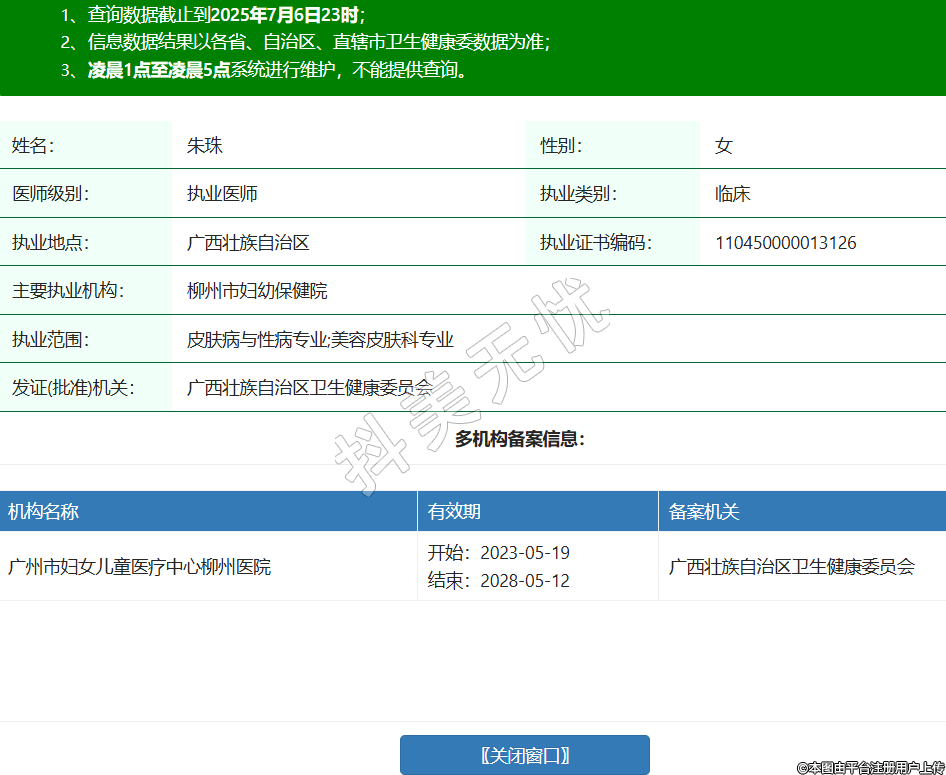 姓名:朱珠性別:女醫(yī)師級別:執(zhí)業(yè)醫(yī)師執(zhí)業(yè)類別:臨床執(zhí)業(yè)地點:廣西壯族自治區(qū)執(zhí)業(yè)證書編碼:110450000013126主要執(zhí)業(yè)機構(gòu):柳州市婦幼保健院執(zhí)業(yè)范圍:皮膚病與性病專業(yè);美容皮膚科專業(yè)發(fā)證(批準)機關(guān):廣西壯族自治區(qū)衛(wèi)生健康委員會多機構(gòu)備案信息:機構(gòu)名稱 有效期 備案機關(guān) 廣州市婦女兒童醫(yī)療中心柳州醫(yī)院 開始:2023-05-19結(jié)束:2028-05-12廣西壯族自治區(qū)衛(wèi)生健康委員會 -