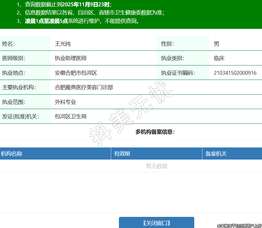 姓名:王光純性別:男醫(yī)師級別:執(zhí)業(yè)助理醫(yī)師執(zhí)業(yè)類別:臨床執(zhí)業(yè)地點:安徽合肥市包河區(qū)執(zhí)業(yè)證書編碼:210341502000916主要執(zhí)業(yè)機構(gòu):合肥蕥典醫(yī)療美容門診部執(zhí)業(yè)范圍:外科專業(yè)發(fā)證(批準)機關(guān):包河區(qū)衛(wèi)生局 -