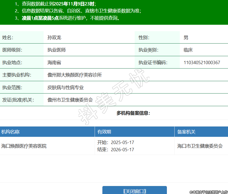 姓名:孫雙龍性別:男醫(yī)師級(jí)別:執(zhí)業(yè)醫(yī)師執(zhí)業(yè)類別:臨床執(zhí)業(yè)地點(diǎn):海南省執(zhí)業(yè)證書編碼:110340521000367主要執(zhí)業(yè)機(jī)構(gòu):儋州那大煥顏醫(yī)療美容診所執(zhí)業(yè)范圍:皮膚病與性病專業(yè)發(fā)證(批準(zhǔn))機(jī)關(guān):儋州市衛(wèi)生健康委員會(huì)多機(jī)構(gòu)備案信息:機(jī)構(gòu)名稱 有效期 備案機(jī)關(guān) 海口煥顏醫(yī)療美容醫(yī)院 開始:2025-05-17結(jié)束:2026-05-17??谑行l(wèi)生健康委員會(huì) -