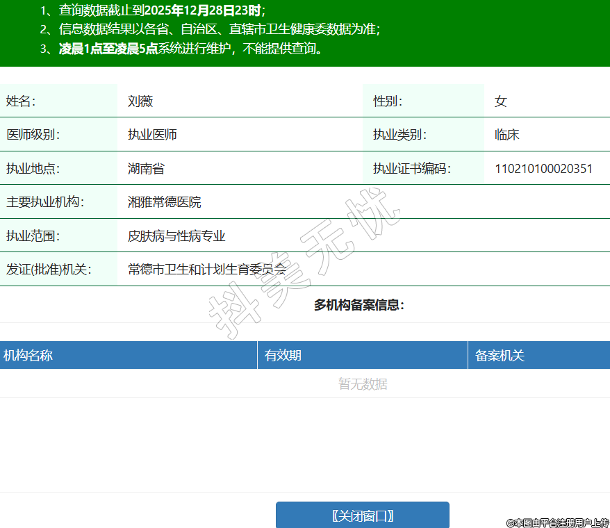 姓名:劉薇性別:女醫(yī)師級別:執(zhí)業(yè)醫(yī)師執(zhí)業(yè)類別:臨床執(zhí)業(yè)地點:湖南省執(zhí)業(yè)證書編碼:110210100020351主要執(zhí)業(yè)機構(gòu):湘雅常德醫(yī)院執(zhí)業(yè)范圍:皮膚病與性病專業(yè)發(fā)證(批準)機關(guān):常德市衛(wèi)生和計劃生育委員會 -