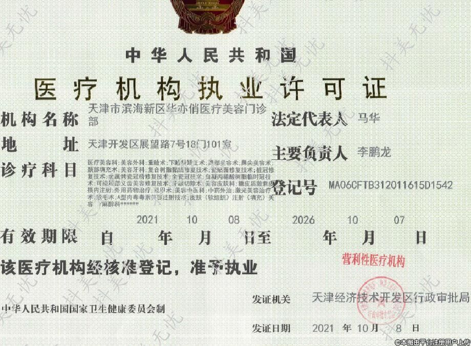 機(jī)構(gòu)名稱:天津市濱海新區(qū)華亦俏醫(yī)療美容門診部