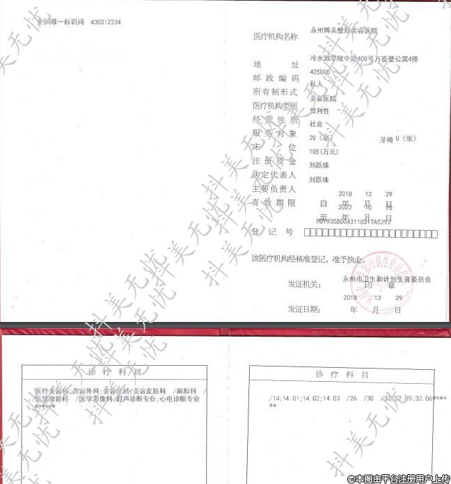 診療科目:美容外科;美容牙科;美容皮膚科/麻醉科/醫(yī)學(xué)檢驗(yàn)科/醫(yī)學(xué)影像科;超聲診斷專業(yè);心電診斷專業(yè)******/14;14.01;14.02;14.03/26/30/32;32.05;32.06******