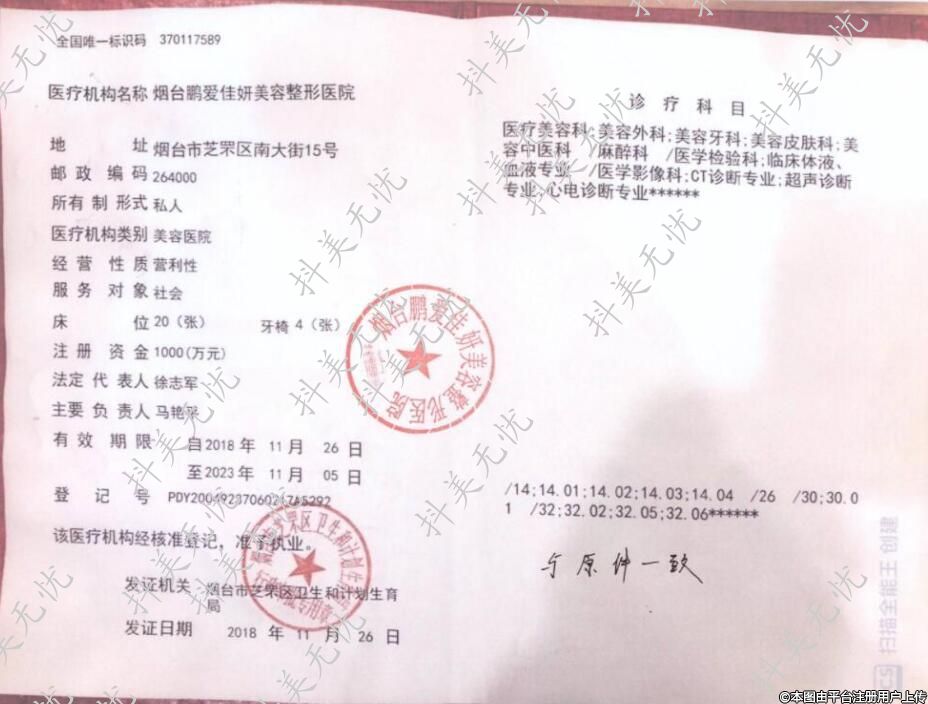 醫(yī)療機(jī)構(gòu)名稱(chēng):煙臺(tái)鵬愛(ài)佳妍美容整形醫(yī)院