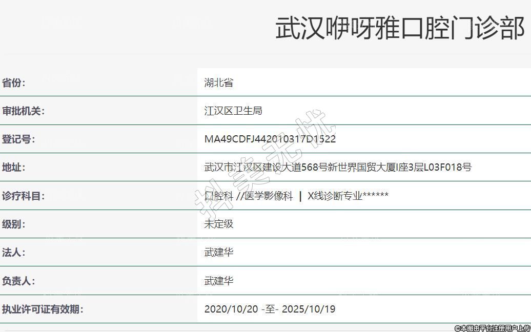 武漢咿呀雅口腔成立于2019-11-08,地址:武漢市江漢區(qū)建設(shè)大道568號新世界國貿(mào)大廈I座3層L03F018號,診療科目:口腔科 //醫(yī)學影像科 | X線診斷專業(yè)******